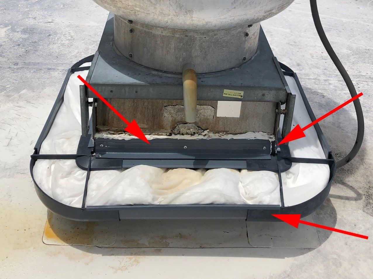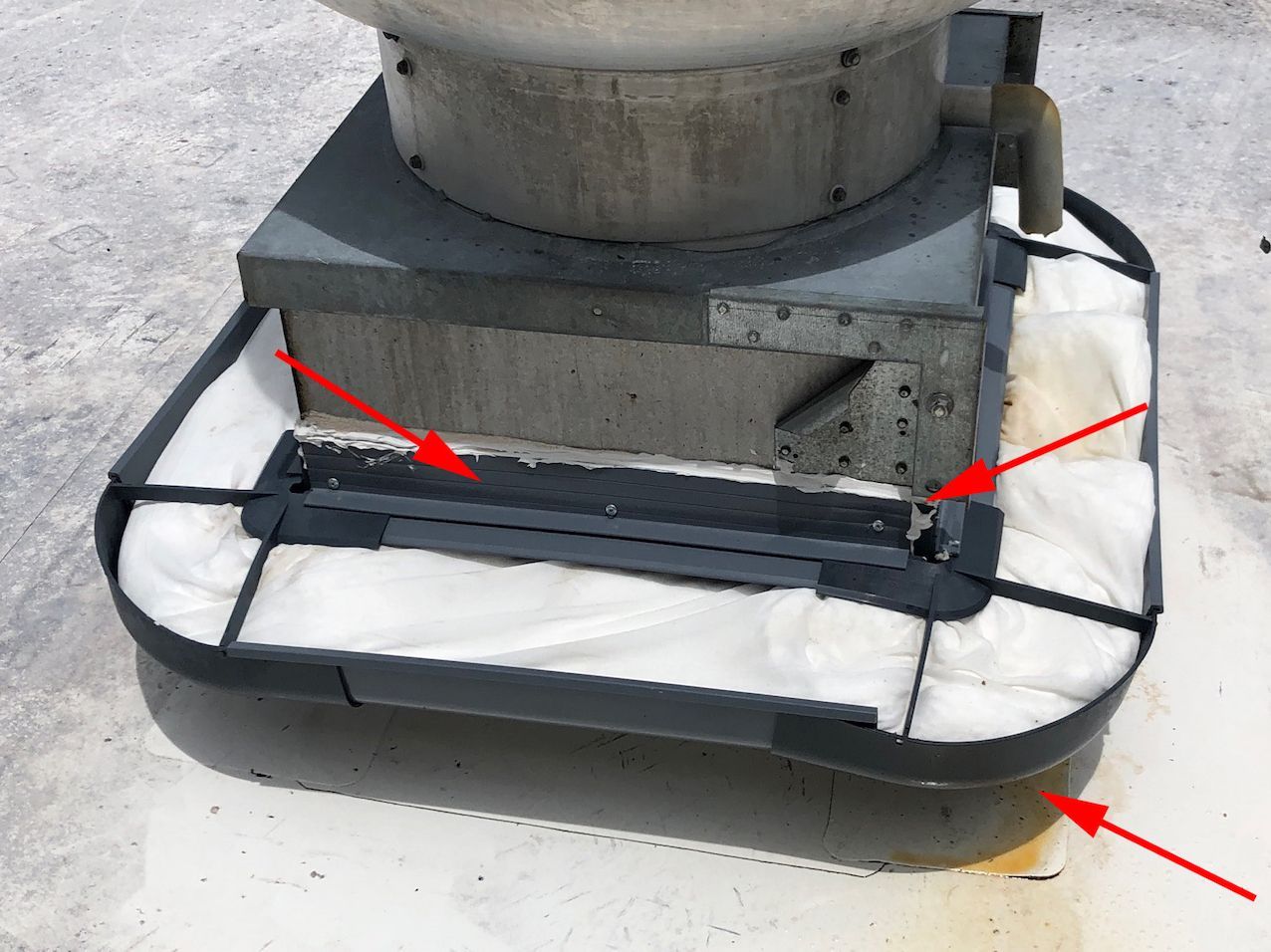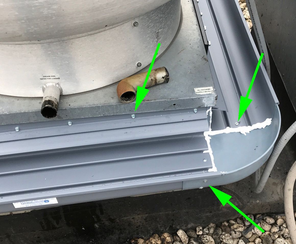 This picture is a perfect example of an improperly installed Grease Gutter® containment system. Due to the improper installation, it set this brand-new system up for failure. The corners of the gutter were not installed flush with the trough, this disrupted the engineered flow of the Grease Gutter®. Let’s analyze what happened here. To begin, there are only three screws; the gutter is not securely mounted onto the curb of the fan. On a properly installed system you would see eight screws equally spaced along the curb of the fan, universally spread on each side. This secures the Grease Gutter® troughs. Secondly, the corners should be flush with the secured trough lengths with screws securing it in place, along with caulking placed in all the seams. Additionally, the holes on the spout side should be sealed with caulking and only the holes on the backside remain open for water-flow. When all these measures are applied, the corners will sit flush with the trough and not sag as seen.